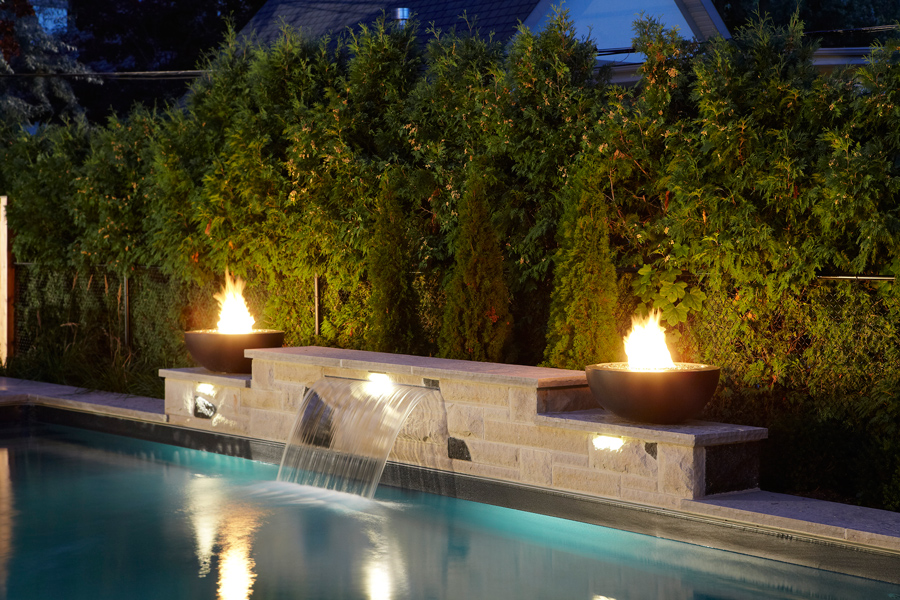 The Maddens elegant Rectangle Pool is the perfect blend of simplicity and modern design. Creating a backyard retreat can be your opportunity to include as many items as you like, or in this case, maintain a clean and simplistic atmosphere that projects beauty and elegance. The crisp line of the Sheer Descent boxes in the shape of the pool provide a three-tiered design that features a breathtaking Sheer Descent Waterfall in the center that cascades water gently into the pool. Underwater Lighting is a crowd-pleaser for those evening and late-night dips with friends while the rich colour palette showcases the natural beauty of the Full Black Galaxy Liner and surrounding stonework. This is truly a backyard retreat to be enjoyed with friends and family on any occasion.