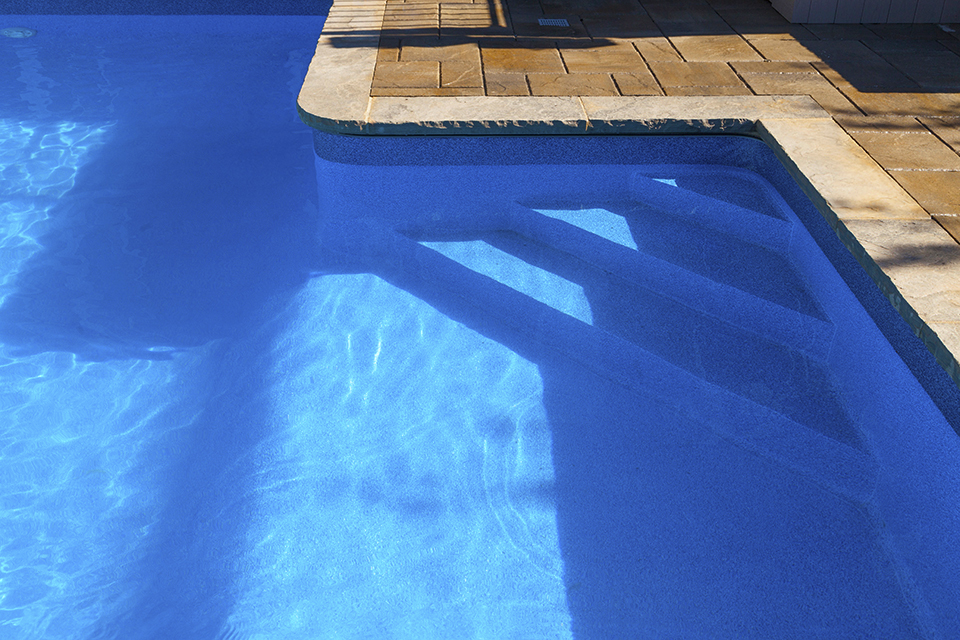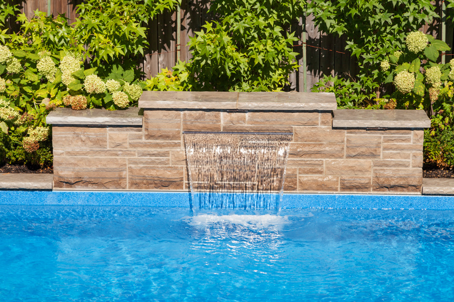 Another space-saving option includes the Diagonal Inside Corner Vinyl Over Steel Step strategically placed closest to the home’s backdoor. Step into these inviting waters and soak your head underneath the cascading waters from the sheer descent water feature to truly unwind.