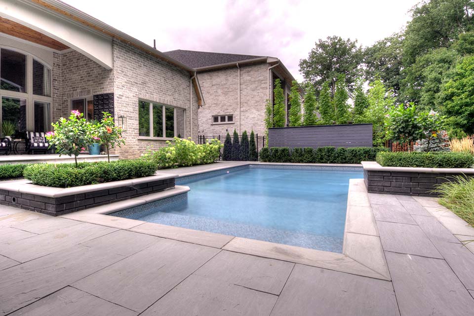The black and white, and teal patio pieces thoughtfully match the pool and Salem home. While the rich teal-coloured pool water offers a breathtaking view thanks to our Full Reef Vinyl liner. We believe that every inch of the Salem backyard screams luxury and we could not be more in awe of this glamorous space.