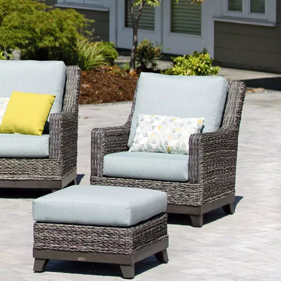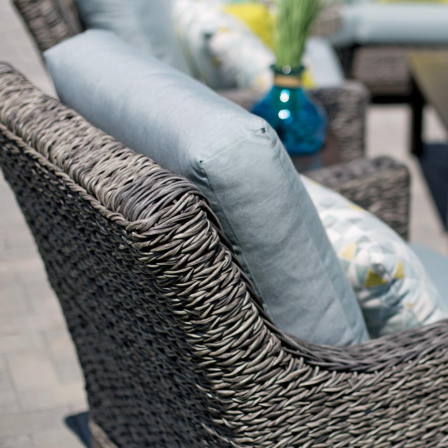 - Smoke grey weave with non-fading, mildew resistant wicker and Sunbrella fabric