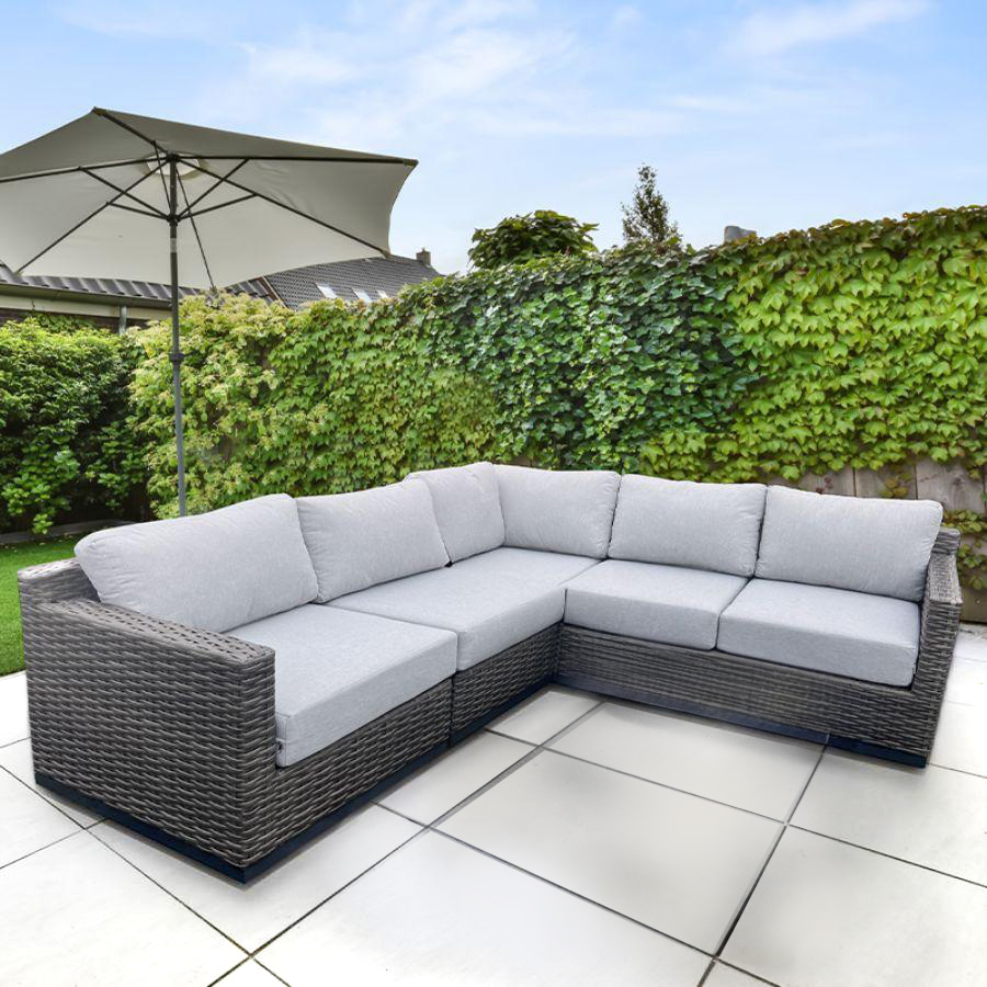 Sit back and relax on the Kelly sectional! This 5 piece sectional features a sturdy, aluminum frame and neutral, grey cushions - making it the perfect addition to any outdoor space.