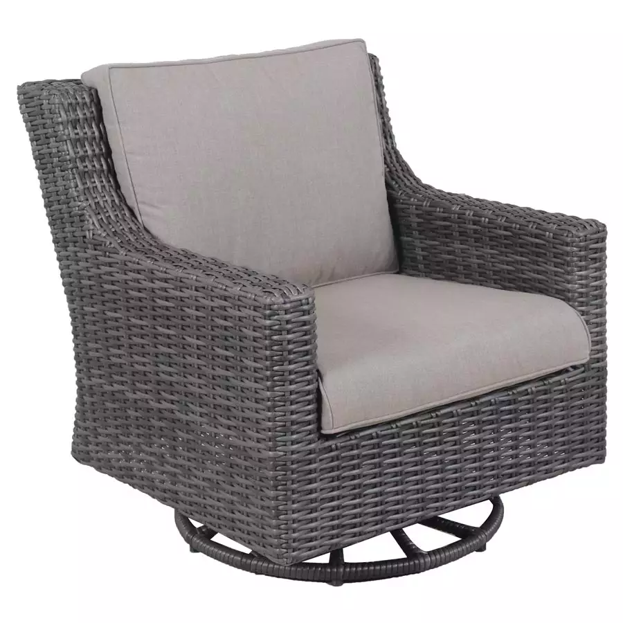 The Lake Mead Swivel Chair is elegant and convenient. Enjoy 360° views of your backyard paradise in this easy-to-maneuver chair. The Swivel Chair has a charming, walnut, resin wicker and a plush, Sunbrella cushion in the shade Cast Shale.