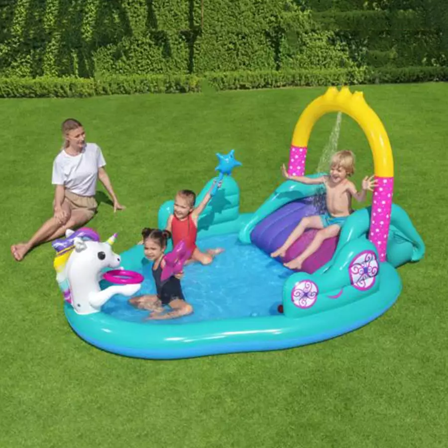 Have an enchantingly fun day in the sun with the Magical Unicorn Carriage Play Center! You can slide and splash around all day long. An added bonus is the double slide, so two kids can go at once. For even more fun, connect a garden to the hose to have water shower the kids just like sprinkles of fairy dust!