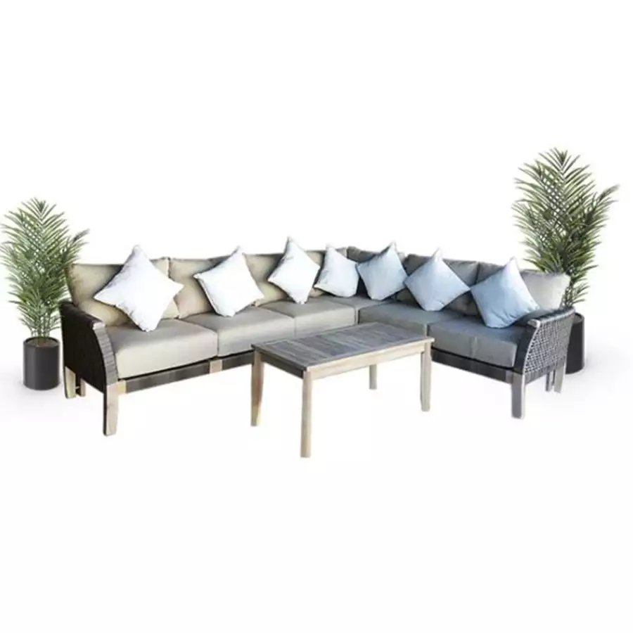 This hardwood set has woven wicker sides and accents. This sectional was made for comfort, comes with acrylic cushions, accent pillows, and a wooden slat coffee table. Hardwood offers a rustic look with its solid, durable frame that resists wear and tear.