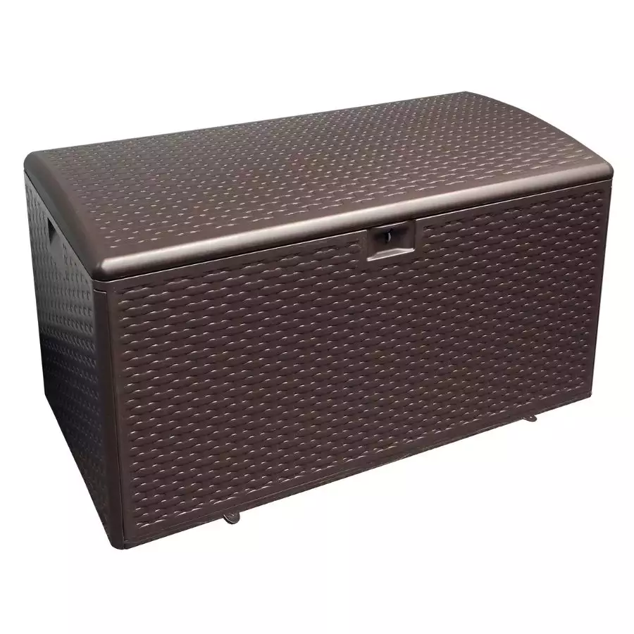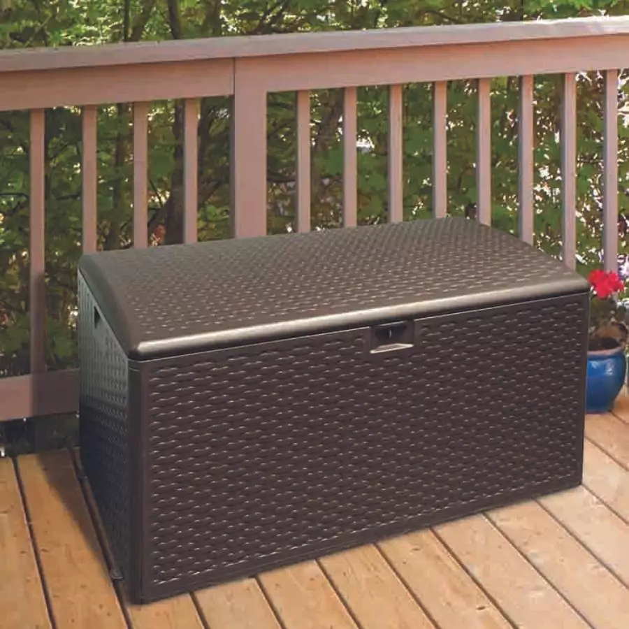 Keep accessories tucked away using this wonderful storage box! Designed with a quick-assemble frame and an easy latch lid, its perfect for storing chair cushions, pool toys and picnic blankets. Weather resistant in a decorative wicker look makes it perfect for using all year round on the deck, porch or patio.