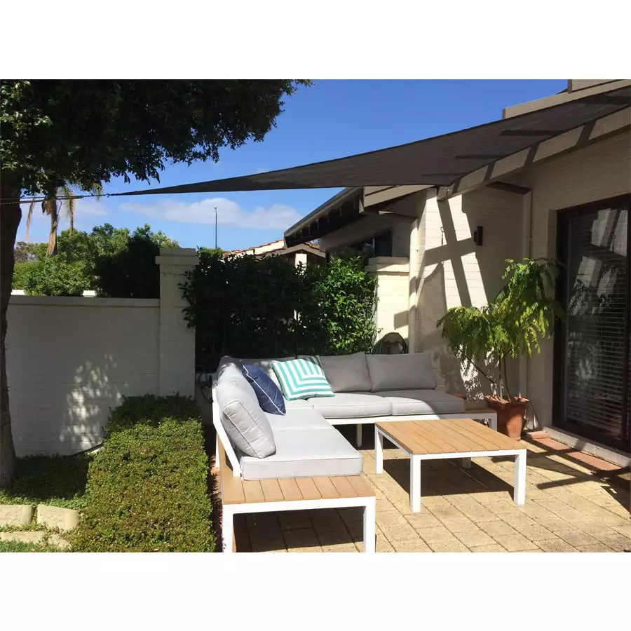 The Black Triangular sail is 5 x 5 x 5 meters in size. It comes with three adjustable aluminum posts to anchor into your space. Each with a pulley system to adjust or angle the shade to where you want it. Available in three different sunbrella fabrics.